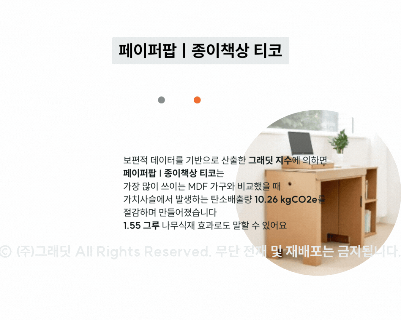 - 주요 소재ㅣ 재활용 종이 50%를 함유한 골판지로 제작되었으며, 사용 후 70% 이상 다시 재활용이 가능합니다. 몸통은 크래프트 칼라 공통이지만, 상판은 크래프트, 화이트 그레이, 다크 그레이 색상 중 선택할 수 있어요.
