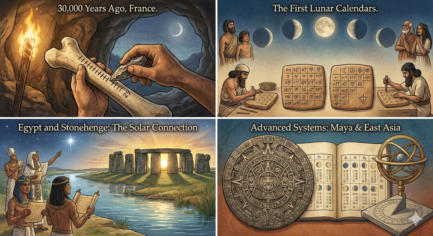 3만년 전 프랑스의 어느 동굴. 누군가 뼈에 작은 홈을 새기고 있었어요. 29개의 홈. 정확히 달이 차고 기우는 한 주기였죠. 학자들이 '달 주기를 기록한 것일 수 있다'고 보는, 아주 이른 시기의 흔적이에요. 아마도 사냥하기 좋은 날을 기억하거나, 특정 동물이 나타나는 시기를 예측하려고 했을 거예요. 왜 달력이 필요했을까요? 농사를 지으려면 씨 뿌릴 때를 알아야 했고, 사냥을 하려면 동물들의 이동 시기를 맞춰야 했으니까요. 계절이 바뀌는 걸 예측하고, 중요한 의식을 치를 날을 정하는 것. 그게 생존의 문제였던 거죠.