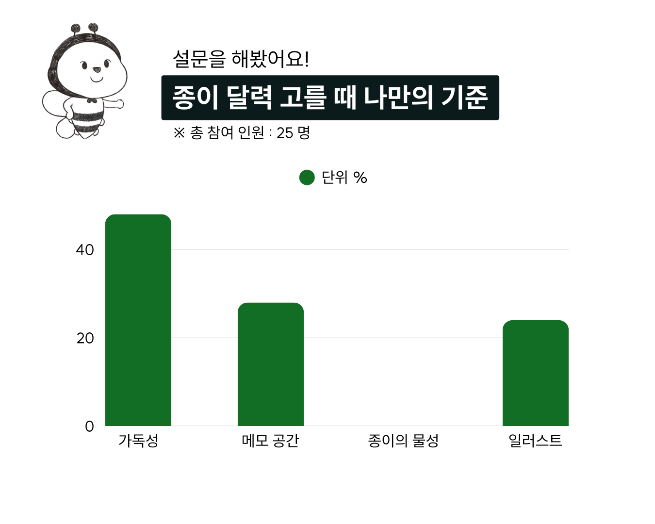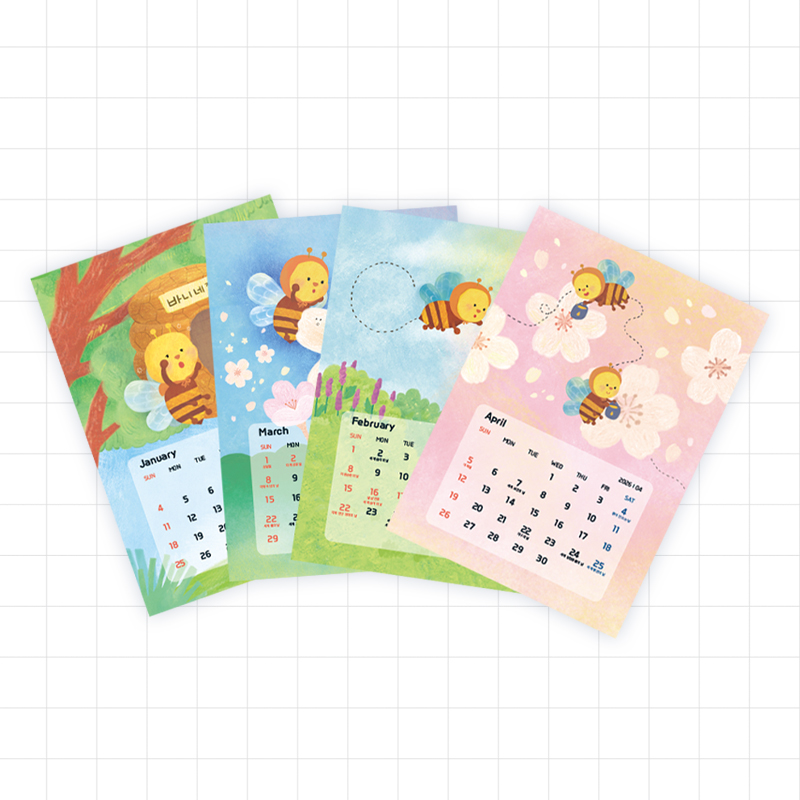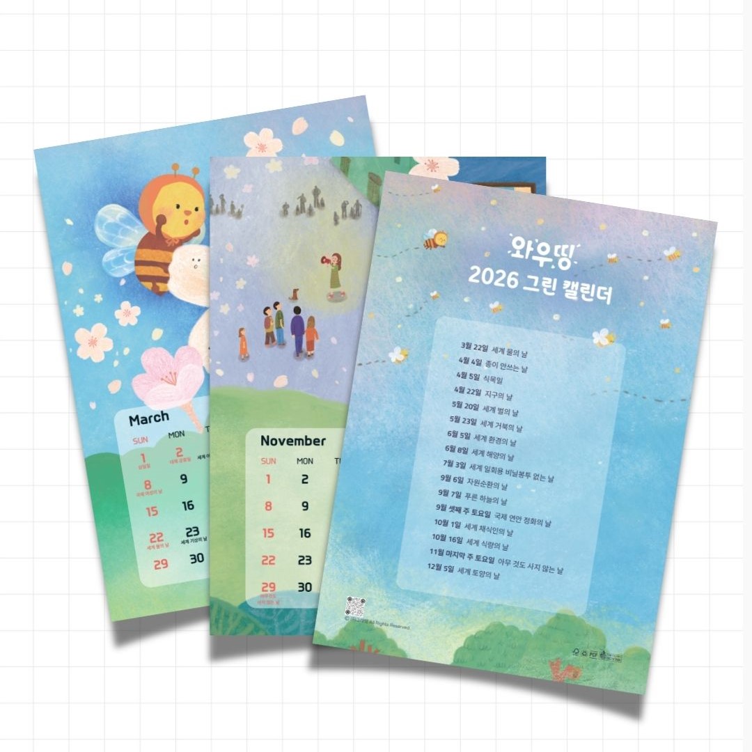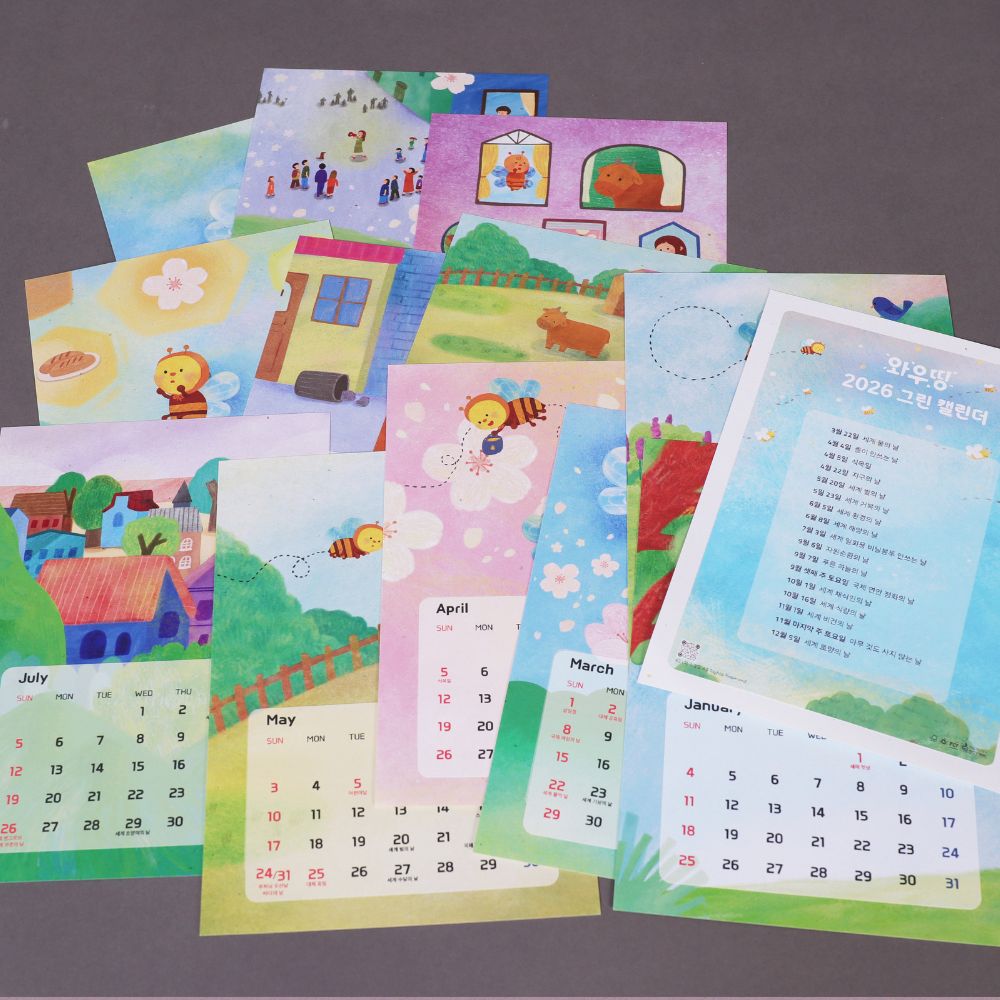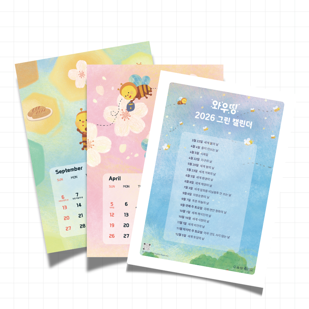 - 특징ㅣ 휴대하기 좋은 B6 사이즈의 월별 낱장 달력입니다. 책상 보드판이나 벽면, 바닥에 붙여 사용할 수 있어 공간을 차지하지 않고, 매월 교체하는 재미도 있어요. 와우띵 브랜드에서 개발한 멸종위기 꿀벌 스토리를 담은 화사한 일러스트 배경과, 멀리서도 잘 보이는 두꺼운 글씨체로 가독성을 확보했습니다. 매달 중요한 환경기념일도 표시되어 있어요. 두 가지 옵션이 있습니다. 스티커 덧댐형은 2025년 남은 소량의 재고에 날짜 부분만 스티커로 덧댄 형태로, 재고 폐기를 막고 수명을 늘리자는 취지로 만들었어요. 스티커 자체는 완전히 환경친화적이라 할 수 없지만, 덧댐으로써 종이에 두께감이 생긴 장점도 있습니다. 일반형은 100매 이상 주문 고객 대상으로만 판매 가능하며, 이 경우 탁상형으로의 제작도 협의 가능합니다.
