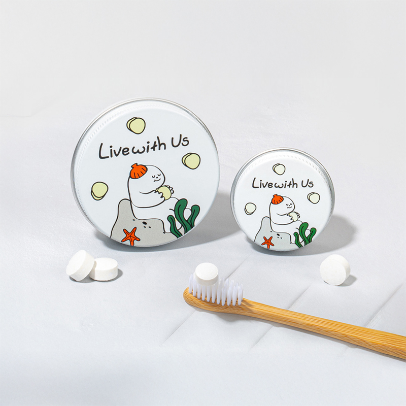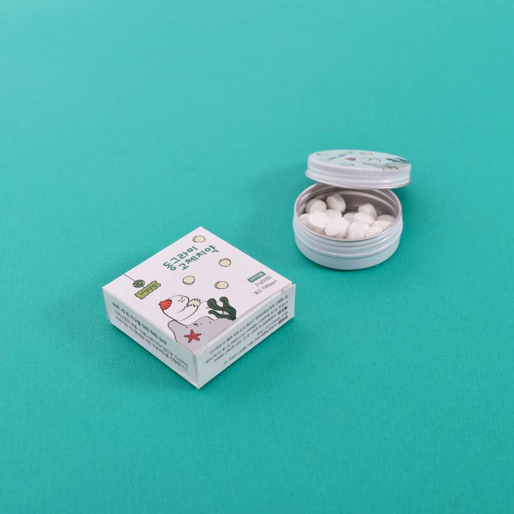 - 특징ㅣ 알약 형태의 고체 치약으로, 동그란 틴케이스(은색 금속 케이스)에 담겨 있어요. 플라스틱 튜브가 필요 없고, 포장도 종이 완충재 등으로 최소화했습니다. 천연 성분이 자연스럽게 계면활성제 역할을 해서 거품은 적게 나지만, 세정력과 청정 효과는 우수해요. 1정을 입에 넣고 몇 번 씹은 뒤 평소처럼 양치하면 돼요. 칫솔 없이 씹고 물과 함께 가글처럼 사용할 수도 있어서, 기내나 여행, 캠핑 등 휴대가 필요한 상황에 유리합니다.