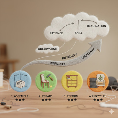 단추 달기, 헤진 옷 꿰매기, 망가진 의자 다리 고치기. 이미 가진 것을 고쳐서 다시 쓰는 거예요. 난이도는 중간 정도죠. 바늘에 실 꿰는 법, 목공용 접착제 쓰는 법 같은 기본 도구 사용법이 필요하니까요. 재료는 최소한이에요. 실, 단추, 접착제 정도만 있으면 돼요. 학교 교복 단추 떨어졌을 때 엄마한테 달라고 하는 대신 직접 달아본 경험, 있으시죠? 그게 바로 수선 DIY입니다.