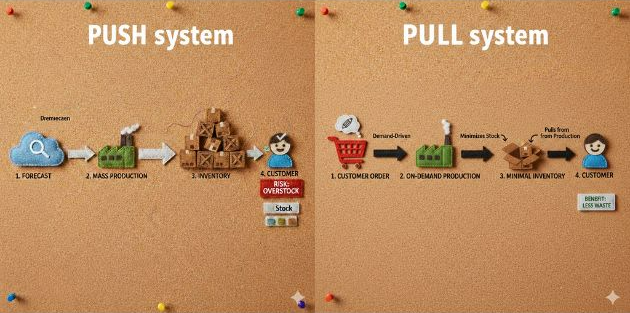 제조업에는 크게 두 가지 생산 방식이 있어요. 하나는 Push 시스템, 다른 하나는 Pull 시스템입니다.