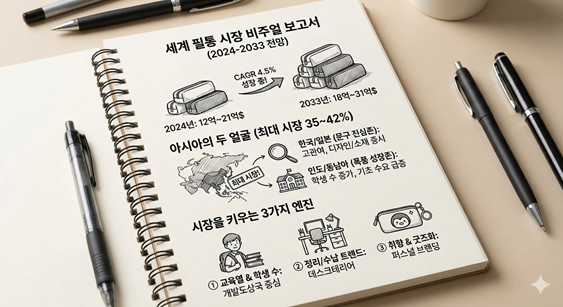 필통이라는 작은 소비재 시장, 제대로된 데이터라도 있을까? 조금 걱정을 했지만, 그런데 의외로 관련 시장에 대한 내용들을 많이 찾아볼 수 있었어요. Dataintelo 등 여러 보고서에 따르면, 2024년 전 세계 필통 시장 규모는 약 12억~21억 달러 수준으로 추정되며, 2033년에는 18억~31억 달러까지 성장할 전망이라고 해요. 연평균 성장률(CAGR)은 4.5% 안팎으로 작은 학용품 치고는 꽤 묵직한 숫자죠.