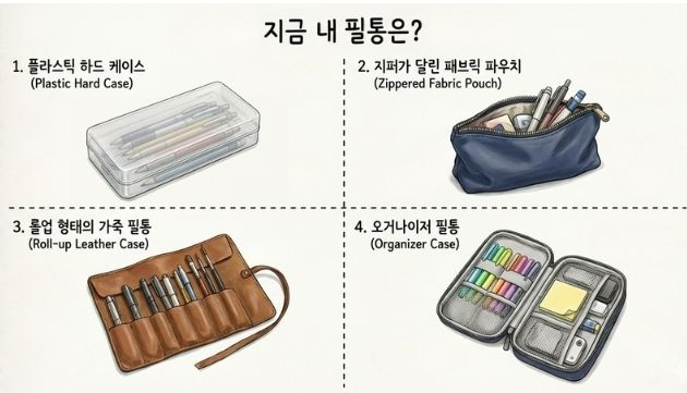 필통 종류는 꽤 다양해요. 저는 개인적으로 수납과 정리가 편리한 스타일을 좋아해요. 반면 가볍고 작은 파우치형을 선호하는 사람들도 많죠. 유연해서 가방 속 빈 공간에 쏙 들어가니까요. 롤형은 펼치면 내용물이 한눈에 보여서 붓이나 마카처럼 긴 도구 쓰시는 분들이 애용하고, 요즘 가장 빠르게 늘고 있는 건 오거나이저형이에요. 칸이 나뉘어 있어서 종류별로 꽂아두면 딱 정리되는 느낌이 들거든요.