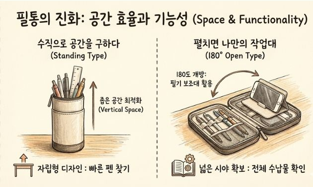 기능 면에서도 변화가 있어요. 요즘 나오는 제품들 보면 지퍼가 180도로 활짝 열리거나, 세워두면 펜꽂이가 되거나, 접으면 필기 보조대로 쓸 수 있는 것들이 많아요. "이 공간을 어떻게 하면 더 효율적으로 쓸 수 있을까"를 고민한 흔적이 보이는 거죠. 스탠딩형 필통이 인기를 끄는 것도, 책상 위 공간을 수평이 아니라 수직으로 활용하고 싶어하는 욕구를 반영한 거고요.